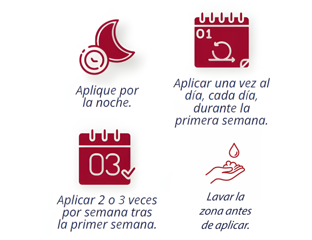 Generalmente se recomienda una aplicación nocturna diaria durante la primera semana y luego solo cuando sea necesario, lo que puede variar entre 2-3 veces por semana o incluso cada 2 semanas, según cada persona.